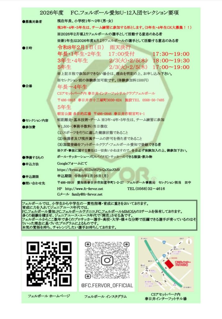 【U-12セレクション情報】 新着情報 下記の日程でセレクションを行います。 志し高く、夢と情熱を持ってサッカーに取り組む仲間を募集しています。 詳細は下記にて!フェルボールで高みを目指そう。 申し込みフォーム:https://forms.gle/hKAwVYEx7zfyEAvz7 Tweet Share 全日本U-12サッカー選手権大会愛知県大会優勝! 前の記事 【第6回 OKAYA CUP 東海大会優勝!】 次の記事